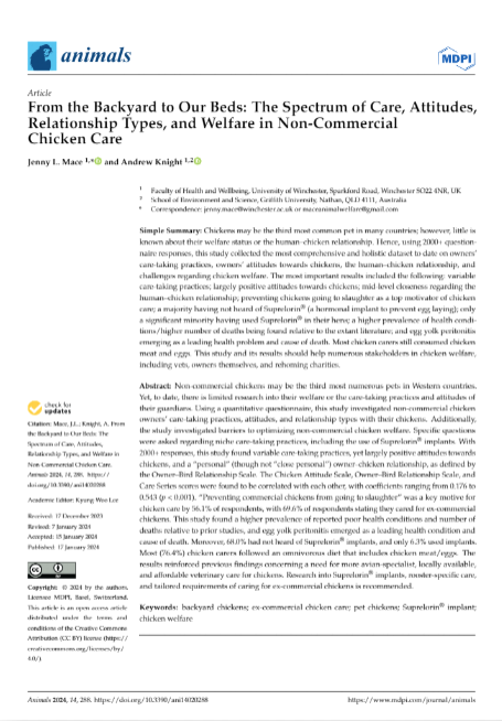 Non-commercial chickens may be the third most numerous pets in Western countries. Yet, to date, there is limited research into their welfare or the care-taking practices and attitudes of their guardians. Using a quantitative questionnaire, this study investigated non-commercial chicken owners’ care-taking practices, attitudes, and relationship types with their chickens. Additionally, the study investigated barriers to optimizing non-commercial chicken welfare. Specific questions were asked regarding niche care-taking practices, including the use of Suprelorin® implants. With 2000+ responses, this study found variable care-taking practices, yet largely positive attitudes towards chickens, and a “personal” (though not “close personal”) owner–chicken relationship, as defined by the Owner–Bird Relationship Scale. The Chicken Attitude Scale, Owner–Bird Relationship Scale, and Care Series scores were found to be correlated with each other, with coefficients ranging from 0.176 to 0.543 (p < 0.001). “Preventing commercial chickens from going to slaughter” was a key motive for chicken care by 56.1% of respondents, with 69.6% of respondents stating they cared for ex-commercial chickens. This study found a higher prevalence of reported poor health conditions and number of deaths relative to prior studies, and egg yolk peritonitis emerged as a leading health condition and cause of death. Moreover, 68.0% had not heard of Suprelorin® implants, and only 6.3% used implants. Most (76.4%) chicken carers followed an omnivorous diet that includes chicken meat/eggs. The results reinforced previous findings concerning a need for more avian-specialist, locally available, and affordable veterinary care for chickens. Research into Suprelorin® implants, rooster-specific care, and tailored requirements of caring for ex-commercial chickens is recommended.