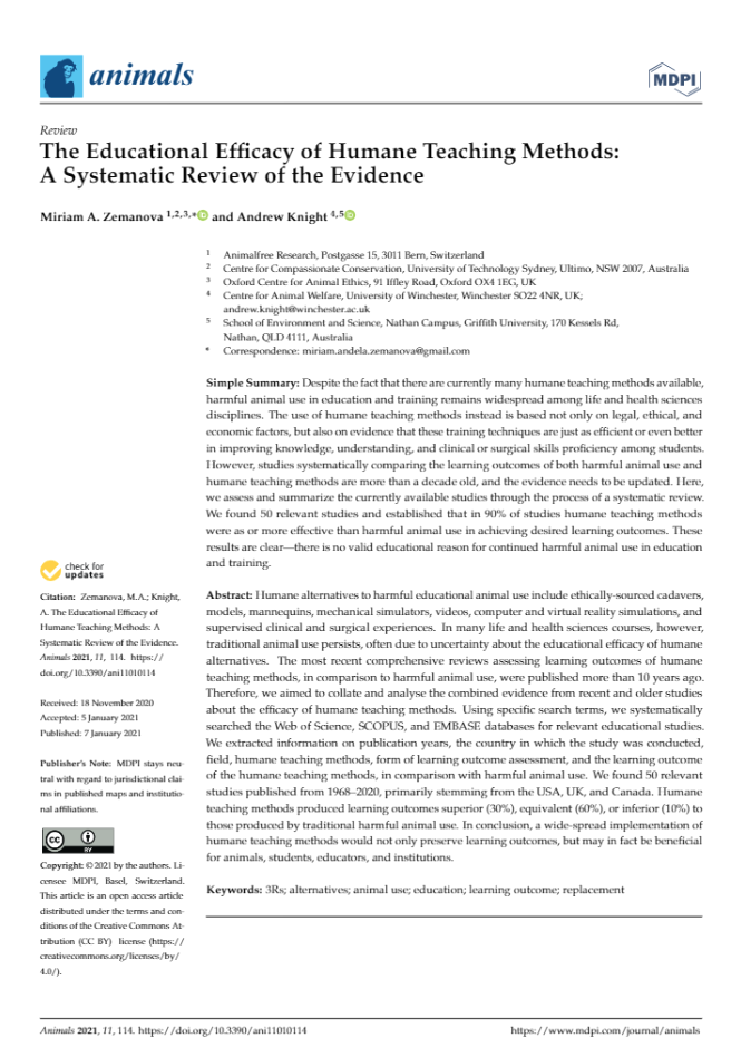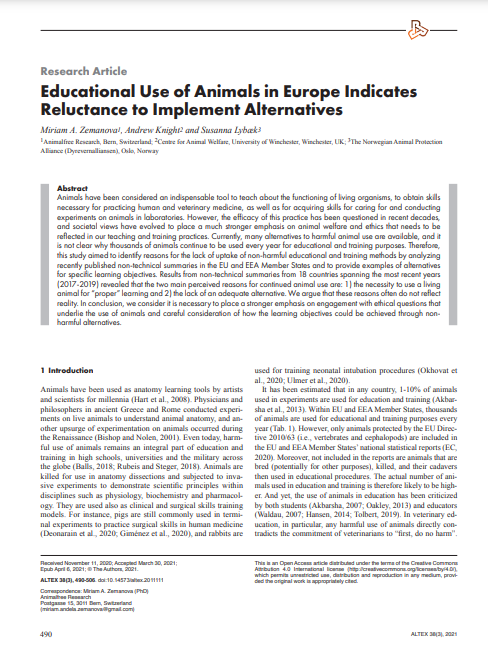 Zemanova MA, Knight A and Lybæk S. (2021). Educational use of animals in Europe indicates a reluctance to implement alternatives. ALTEX – Alternatives to Animal Experimentation, 38(3), pp. 490-506. doi: 10.14573/altex.2011111.