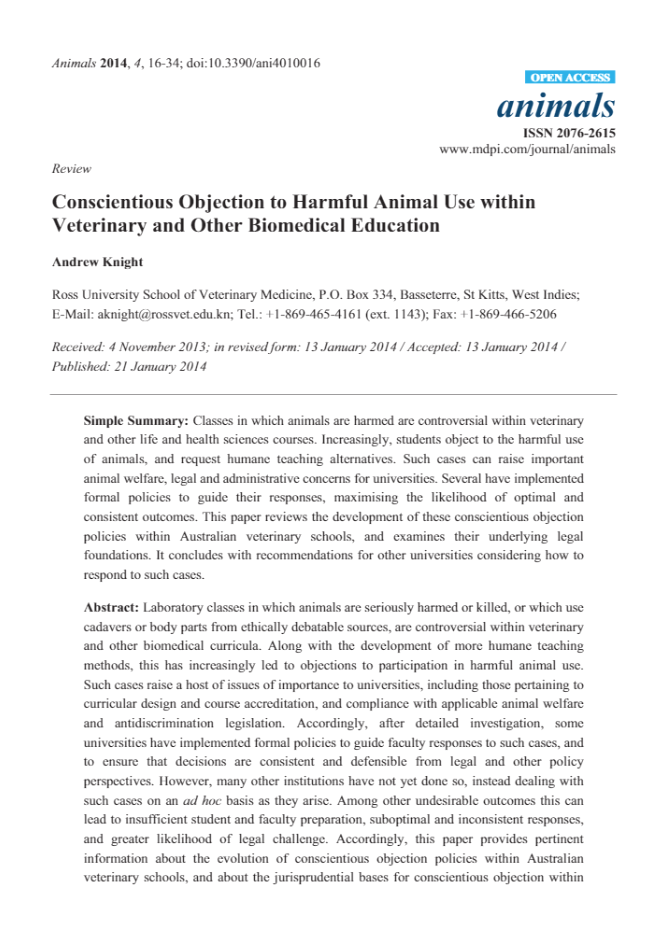 Knight A (2014). Conscientious objection to harmful animal use within veterinary and other biomedical education. Animals, 4, 16-34.