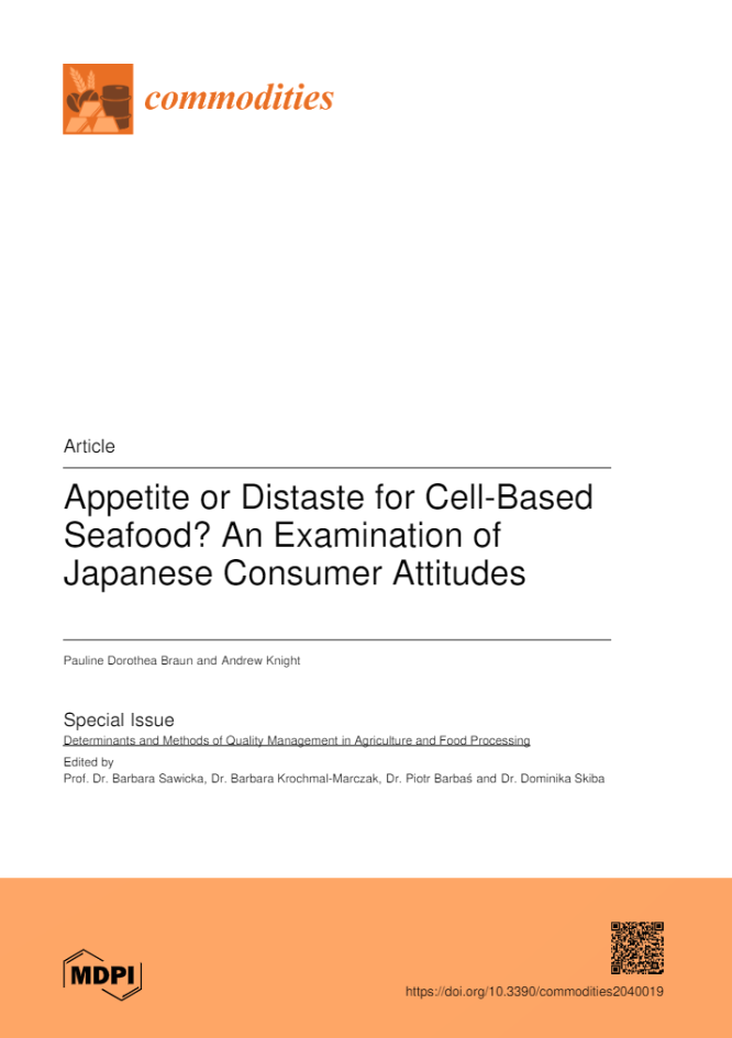 Braun PD & Knight A (2023). Appetite or distaste for cell-based seafood? An examination of Japanese consumer attitudes. Commodities 2(4), pp. 329-354.