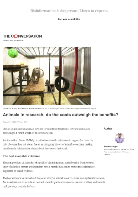 Highly polarised viewpoints about animal experimentation have often prevented agreement. However, important common ground between advocates and opponents was demonstrated within a discussion forum hosted at www.research-methodology.org.uk in July–August 2008, by the independent charity, SABRE Research UK. Agreement existed that many animal studies have methodological flaws — such as inappropriate sample sizes, lack of randomised treatments, and unblinded outcome assessments — that may introduce bias and limit statistical validity. There was also agreement that systematic reviews of the human utility of animal models yield the highest quality of evidence, as their reliance on methodical and impartial methods to select significant numbers of animal studies for review, serves to minimise bias. Unfortunately, disagreement remained that animal experimental licence applications should reference systematic reviews of existing studies, before approval. The UK Medical Research Council requires that researchers planning human clinical trials must reference such reviews of related previous work. Existing knowledge is thereby fully and appropriately utilised, and redundant experimentation is avoided. However, objections were raised that a similar requirement would interfere with animal experimental licensing, because, to date, there have been very few systematic reviews of animal studies. In fact, the relative dearth of such reviews is a matter of considerable concern, and may partially explain the very poor human success rates of drugs that appear safe and/or efficacious in animal trials. Nevertheless, the disturbing number of human trials which have proceeded concurrently with, or prior to, animal studies, or have continued despite equivocal evidence of efficacy in animals, clearly demonstrate that many researchers fail to conduct adequate prior reviews of existing evidence. Where neither sufficient primary studies, nor systematic reviews of such studies, exist, for citation within a licence application, researchers should be able to provide evidence of this shortcoming, and, concurrently, demonstrate that the available literature and evidence have been adequately reviewed. This should also enable them to clearly demonstrate the need and scientific appropriateness of their proposed study, the validity of its design, and — importantly — that the benefits are reasonably likely to exceed the animal welfare, bioethical and financial costs. Invasive animal studies should never be permitted solely on the basis of less probable, speculative or intangible human benefits, or the mere satisfaction of scientific curiosity.