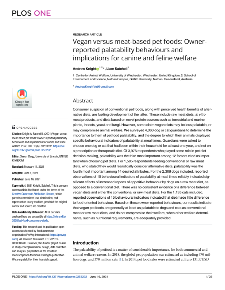 Knight A and Satchell L, (2021). Vegan versus meat-based pet foods: owner-reported palatability behaviours and implications for canine and feline welfare. PLoS ONE 16(6): e0253292.