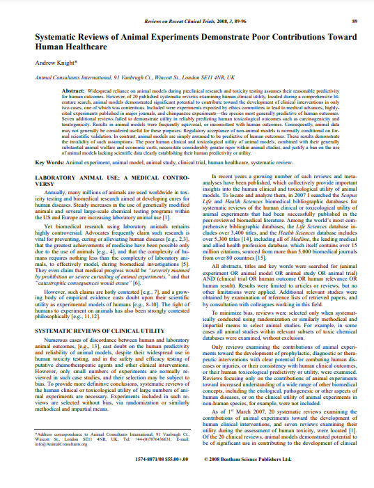 The assumption that animal models are reasonably predictive of human outcomes provides the basis for their widespread use in toxicity testing and in biomedical research aimed at developing cures for human diseases. To investigate the validity of this assumption, the comprehensive ‘Scopus’ biomedical bibliographic databases were searched for published systematic reviews of the human clinical or toxicological utility of animal experiments. Of 20 reviews examining clinical utility, authors concluded that the animal models were substantially consistent with or useful in advancing clinical outcomes in only two cases, and the conclusion in one case was contentious. Included were reviews of the clinical utility of experiments expected by ethics committees to lead to medical advances, of highly-cited experiments published in major journals, and of chimpanzee experiments – the species most likely to be predictive of human outcomes. Seven additional reviews failed to clearly demonstrate utility in predicting human toxicological outcomes such as carcinogenicity and teratogenicity. Consequently, animal da- ta may not generally be assumed to be substantially useful for these purposes. Possible causes include interspecies differences, the distortion of experimental outcomes arising from experimental environments and protocols, and the poor methodological quality of many animal experiments evident in at least 11 reviews. No reviews existed in which a majority of animal experiments were of good quality. While the latter problems might be minimised with concerted effort, given their widespread nature, the interspecies limitations are likely to be technically and theoretically impossible to overcome. Yet, unlike non-animal models, animal models are not normally subjected to formal scientific validation. Instead of simply assuming they are predictive of human outcomes, the consistent application of formal validation studies to all test models is clearly warranted, regardless of their animal, non-animal, historical, contemporary or possible future status. Expected benefits would include greater selection of models truly predictive of human outcomes, increased safety of people exposed to chemicals that have passed toxicity tests, increased efficiency during the development of human pharmaceuticals, and decreased wastage of animal, personnel and financial resources. The poor human clinIcal and toxicological utility of most animal models for which data exists, in conjunction with their generally substantial animal welfare and economic costs, justify a ban on animal models lacking scientific data clearly establishing their human predictivity or utility.