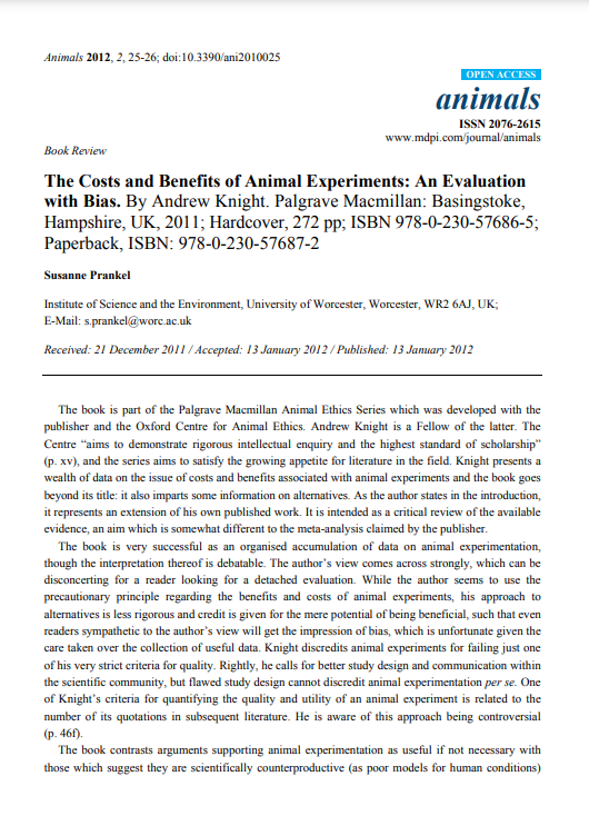 Prankel S (2012). The costs and benefits of animal experiments: an evaluation with bias. Animals, 2, 25–26. doi: 10.3390/ani2010025.